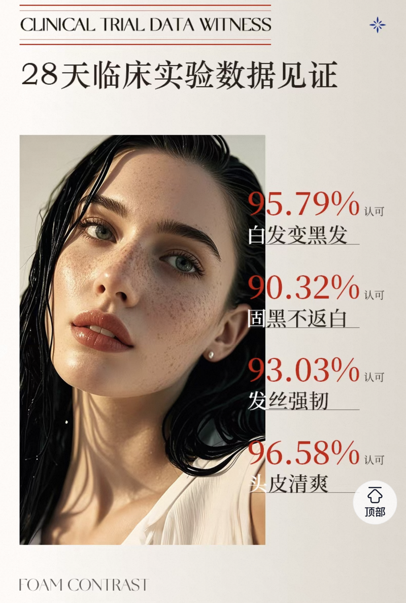 一些“白发洗黑”洗发水的宣传中会提到临床试验数据,让不少消费者更加相信其功效。如VENUAN何首乌洗发水宣称,“有院线级35年白转黑配方,28天临床实验(应为临床试验)数据见证,95.79%认可白发变黑发,90.32%认可固黑不返白,一瓶搞定白断油,真人实测2周白发减少94.32%。”记者咨询VENUAN海外旗舰店该数据的真实性,客服表示,都是品牌方找到真实用户体验后反馈的数据。