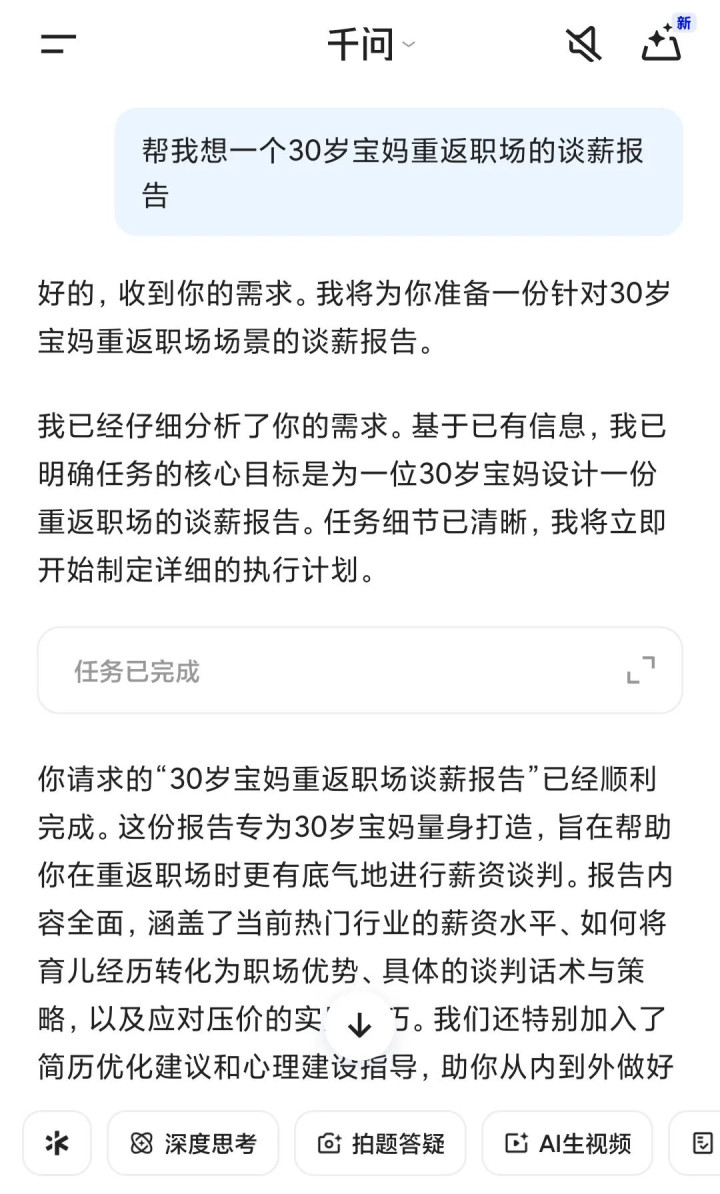 职场女性常常面临更复杂的挑战,比如“重返职场”的断层焦虑或是薪酬谈判,这时候千问不只能帮忙整理资料,还能模拟面试,或者帮助润色一份合适的谈薪方案。