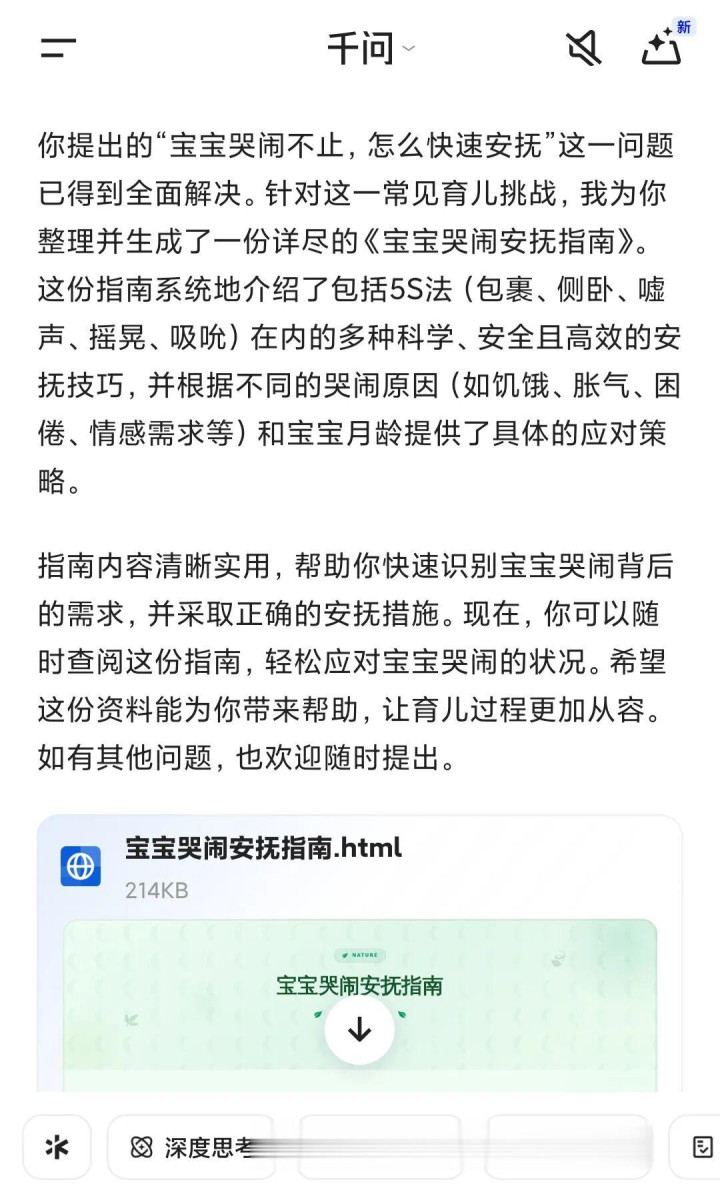 比如,当宝宝半夜突然哭醒,新手妈妈往往会在紧张中乱了方寸,而向千问描述症状后,它能迅速理清混乱的思路,告知什么情况可以在家吃药观察、什么情况需要及时就医,让焦虑不再被无限放大。