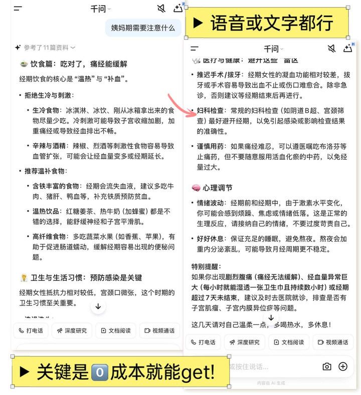 又比如,女性面对一些身体变化或私护健康时,往往会有“不好意思去医院”或“不知如何向人开口”的羞涩与焦虑,而千问可以提供一个私密的探讨空间,帮你判断哪些是正常波动,哪些需要科学护理,在保护隐私的同时带来安全感。