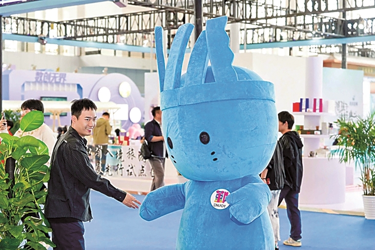 第十届海丝之路文化和旅游博览会上,观众与宁波“IP大联萌”人偶互动。资料图片