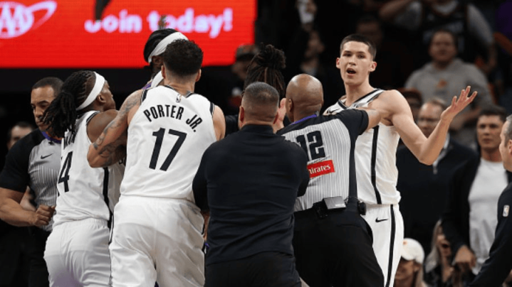 比赛第四节,扎威布耶争抢地板球,杰明随后推倒狄龙&特伦斯-曼推搡奥尼尔,开云官方app下载双方爆发大规模冲突。