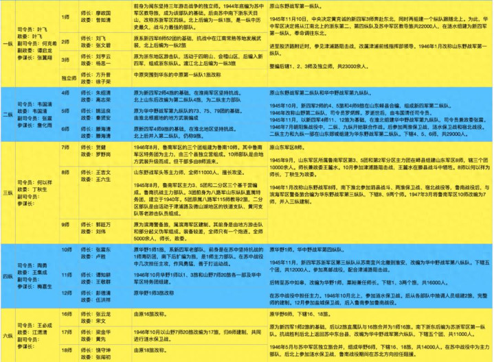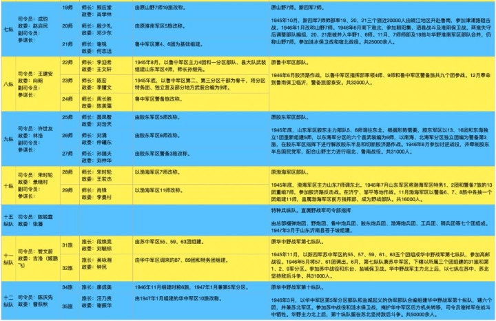 以上,这前七个纵队归华东野战军司令部直接指挥。下面的胶东、渤海军区的两个纵队为独立作战。